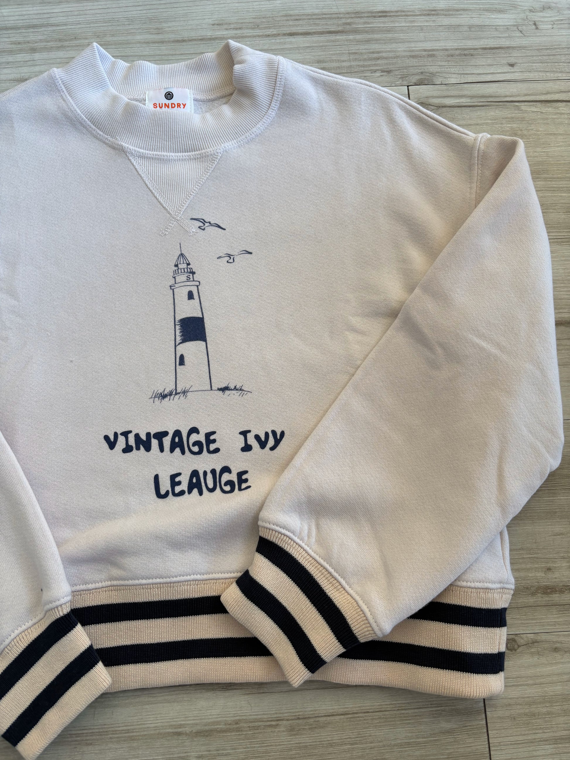 This soft pullover brings a cozy-meets-sporty feel with its relaxed fit and contrast striped trim. Featuring vintage ivy league and lighthouse graphic plus subtle piping along the sleeves and ribbed cuffs and hem, it’s an effortless piece for lounging or layering with laid-back polish.