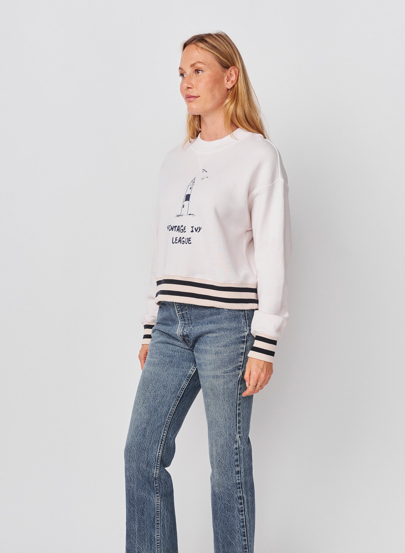 This cropped sweatshirt features a charming “Vintage Ivy League” lighthouse graphic with striped ribbed cuffs and hem for a sporty finish. Its soft fabric and relaxed fit bring a playful collegiate vibe to everyday style.