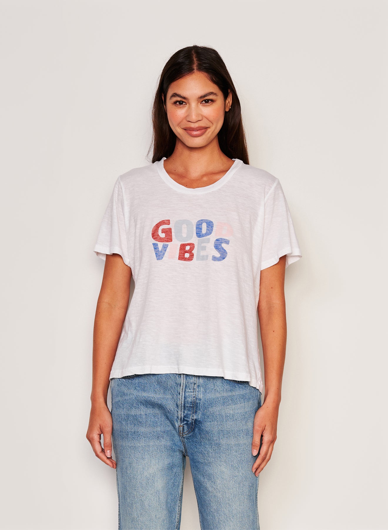 Soft Supima slub tee with rolled short sleeves, crew neck and graphic detail.