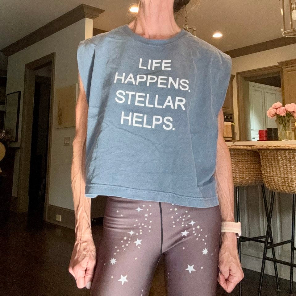 Life Happens. Stellar Helps. Muscle tank with slightly cropped and boxy fit.