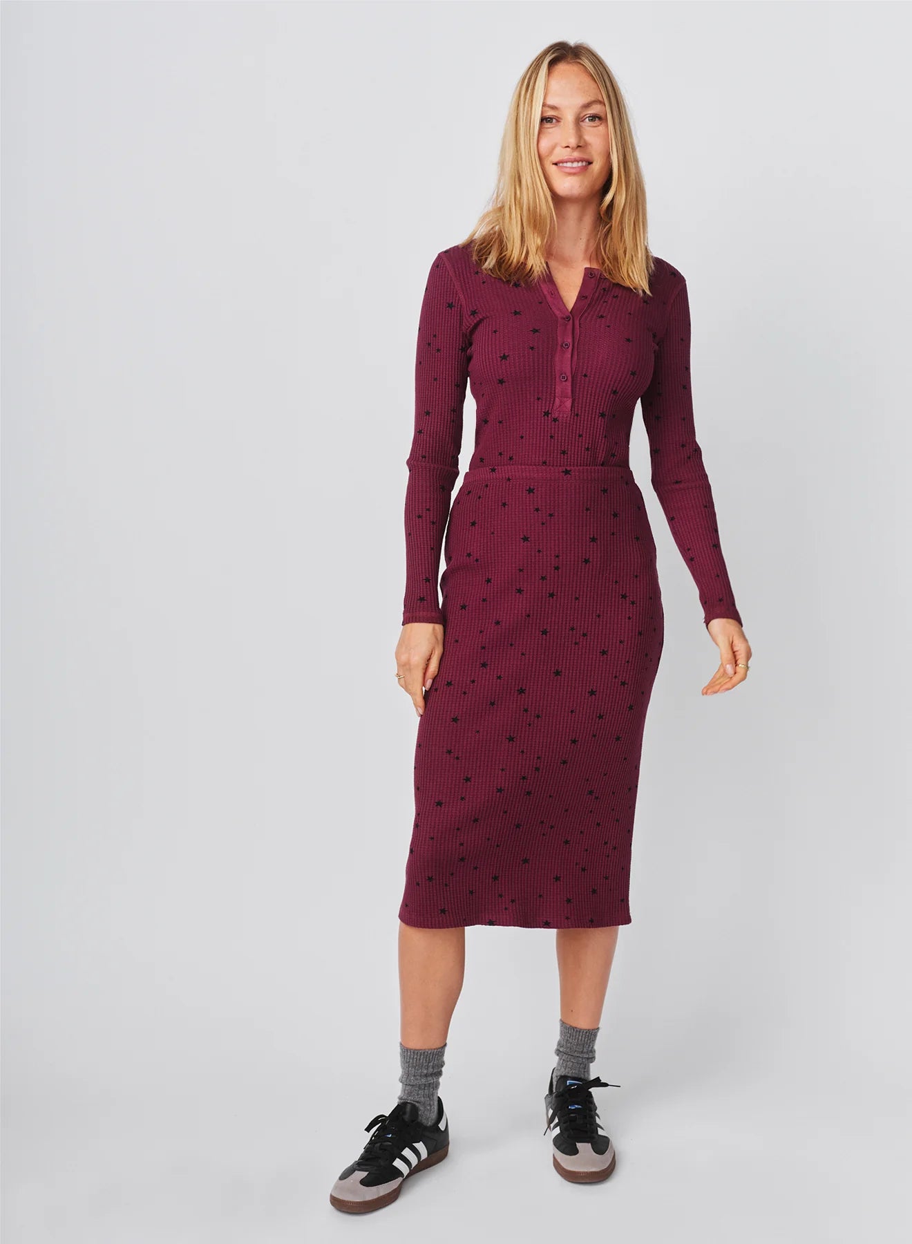 This star-print henley top adds a playful twist to a classic silhouette, crafted in a soft, ribbed knit that hugs the body with a comfortable stretch. Featuring a deep button placket and slim long sleeves, it’s an easy everyday piece that blends cozy texture with subtle celestial charm.