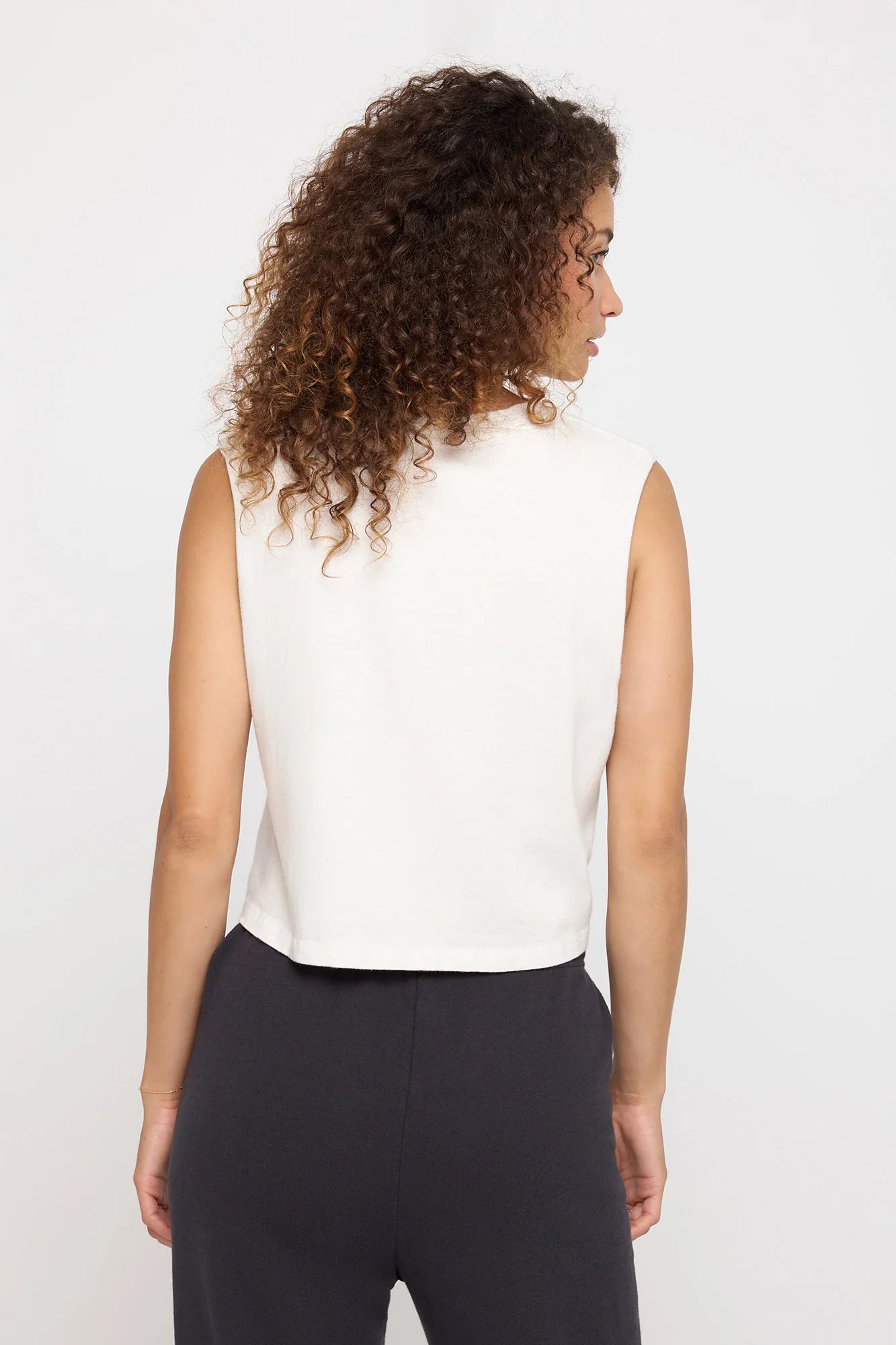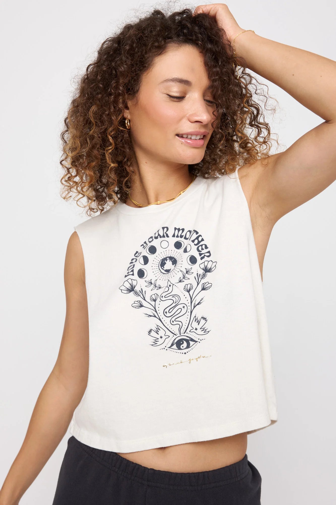 Love your mother earth. A crop length, classic crew neck tank with a boxy fit. Made in Spiritual Gangster's Favorite Jersey fabrication with recycled cotton, this is their most sustainable jersey, with a softener wash added to make it extra luxurious.