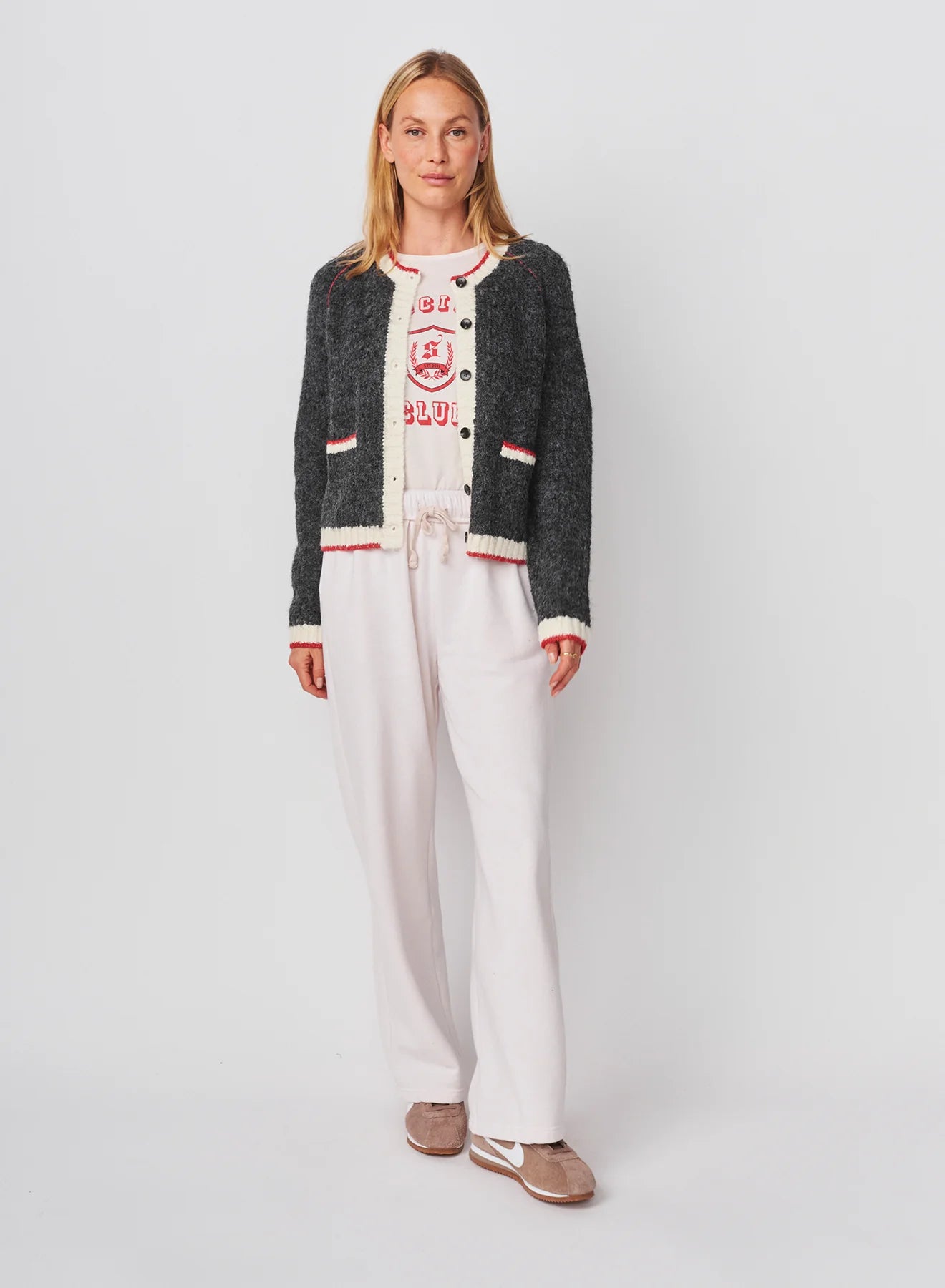 This cozy button-up cardigan features contrast trim in cream and red for a playful, vintage-inspired touch. Textured knit detailing and front pockets add charm to its classic, relaxed silhouette.