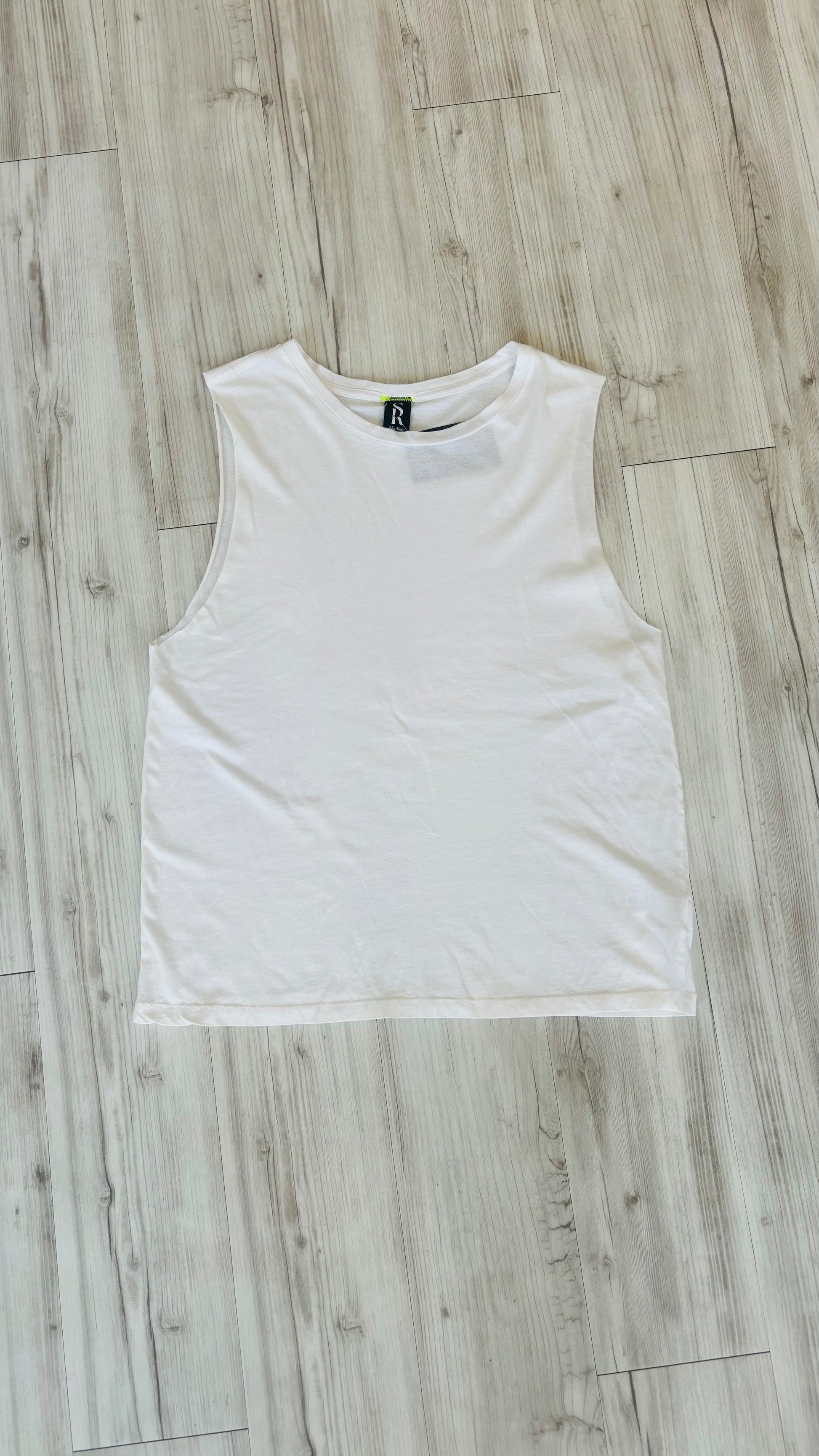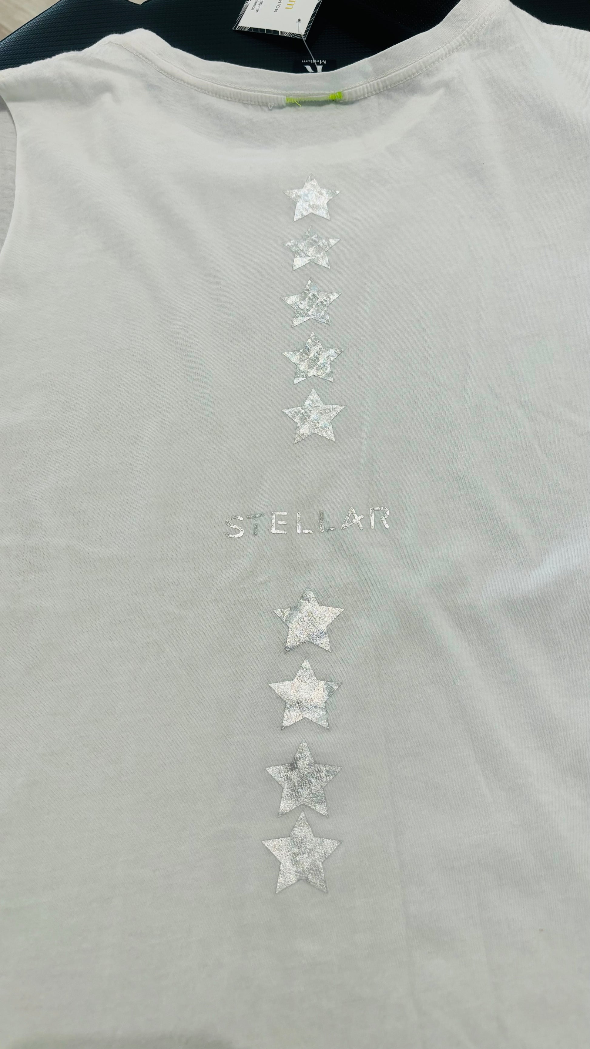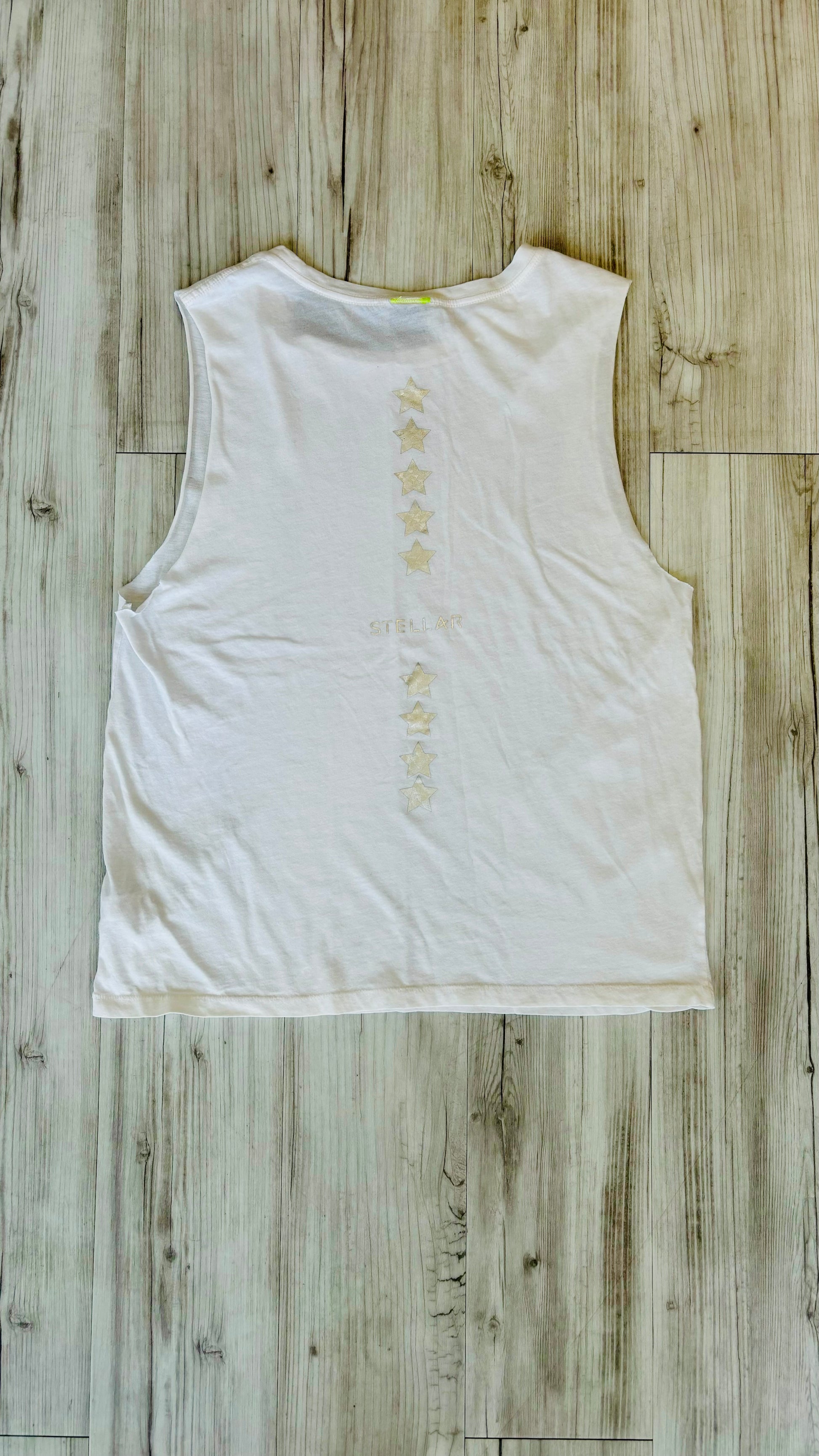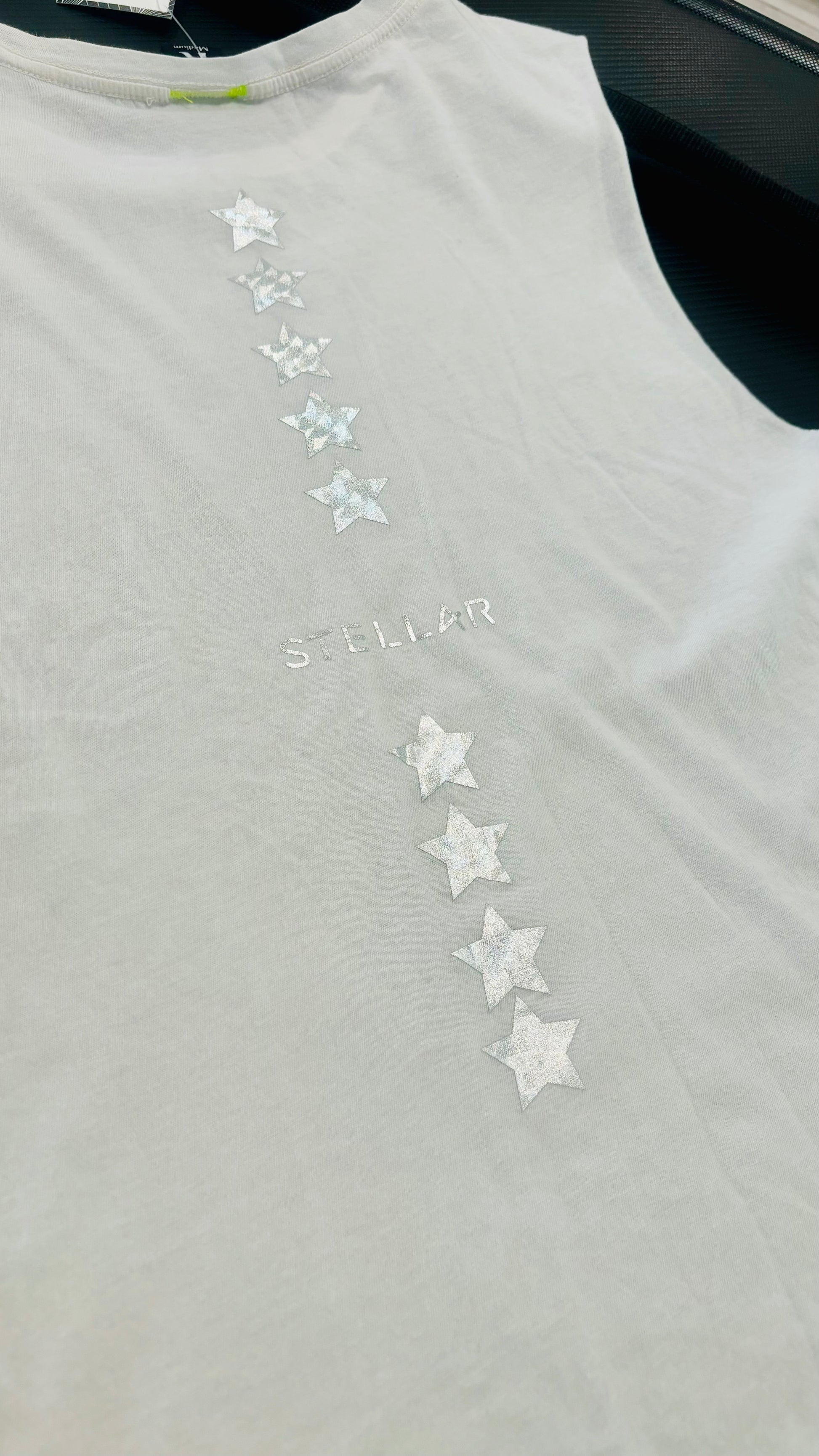 White Tank Top with silver foil stars along back spine with Stellar logo at mid back, also in silver foil. It is a versatile crew neck top with a relaxed fit, both airy & flowy. We love this a-line silhouette as part of a layered look or worn solo. Premium Women's Chic Athleisure wear perfect with leggings, joggers, or biker shorts.