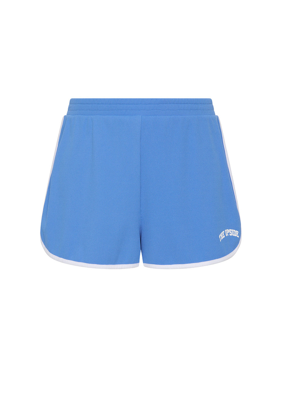 Mini 70s inspired jogger shorts in performance mesh recycled fabrication in bright azure blue